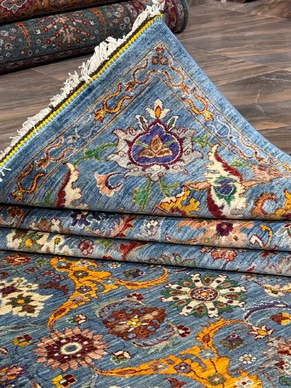 فرش دستباف ۷/۵ متری نقشه اژدری آبی نقره‌ای – پشم دستریس و رنگ گیاهی